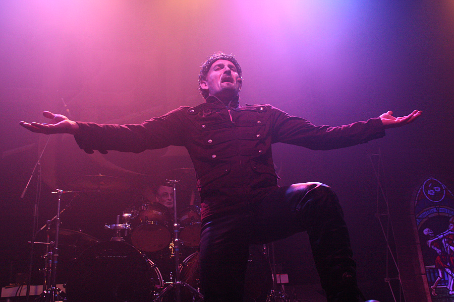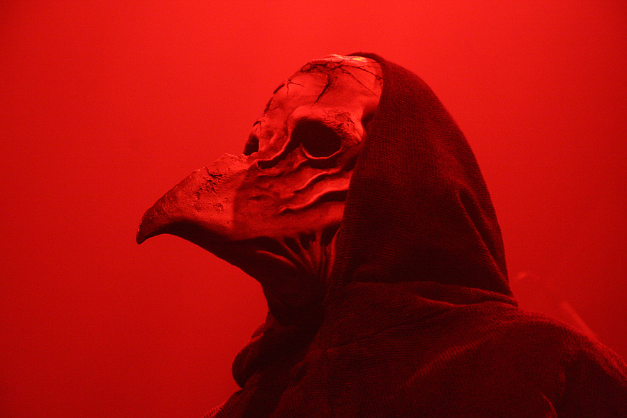 Das optische Hauptaugenmerk liegt aber auf Sänger David Bower, dem man deutlich anmerkt, dass er aus dem Theater kommt. Mit Stacheldraht-Krone auf dem Kopf, blutroten Kontaktlinsen in den Augen und Headset-Mikrofon stürmt er auf die Bühne und beeindruckt nicht nur mit einem außergewöhnlichen Gesang, sondern auch mit seiner lebendigen Performance, bei der er auch immer wieder mit dem Publikum interagiert. Es ist wirklich ein Hochgenuss, wie er mit Gesten und Mimik die Songs interpretiert. Zu "Plague And Fyre" kommt er mit Mönchskutte und schauriger Vogelskelett-Maske auf die Bühne, bei "Blasphemy And The Master" geißelt er seinen nackten Oberkörper mit einer Peitsche. Oder er springt in den Fotograben und legt den Zuschauern in der ersten Reihe die Hände auf, um eine Dämonenaustreibung vorzunehmen. Natürlich merkt man zu jeder Sekunde, dass das nichts anderes als großes, shakespearianisches Theater sein soll, das jedoch ist auch ganz großartige Unterhaltung. In den 45 Minuten, die HELL zur Verfügung stehen, kommen natürlich nur Songs des einzigen Album "Human Remains" zum Zug, die werden von der Band bei gutem Sound (bei dem es nur anfangs leichte Schwierigkeiten gibt) souverän gespielt. Zu einem perfekten Auftritt fehlen nur noch die Höllenfeuer-Pyros, aber die gibt es für eine Vorband natürlich nicht.