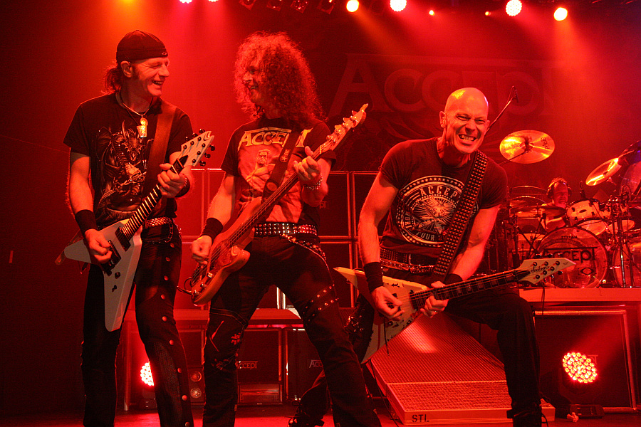 Nach dem "Heaven And Hell"-Intro geht es - etwas überraschend - nicht mit "Hung, Drawn And Quartered", dem Opener des aktuellen Albums los, sondern mit "Hellfire", bei dem die Bühne passend in rotes Licht getaucht ist. Und sofort wird klar, was einen in den nächsten zwei Stunden erwartet. Ein Wolf Hoffmann an der Gitarre, der entweder wie ein Honigkuchenpferd grinst, Grimassen schneidet oder die typischen Posen mit Basser Peter Baltes zur Schau stellt. Die beiden sind die Aktivposten auf der Bühne. Der zweite Gitarrist Herman Frank erledigt seine Aufgabe etwas zurückhaltender, aber ebenfalls mit viel Spielfreude. Alle drei sind für charakteristischen Backing Vocals zuständig, die direkt im folgenden "Stalingrad" zum Zuge kommen. Sänger Mark Tornillo schwenkt in dem Song auch eine ACCEPT-Flagge, was ein bisschen übertrieben pathetisch wirkt, aber sei es drum. Das gehört bei ACCEPT eben auch dazu. Mit "Restless And Wild" folgt der erste Klassiker von 1982, vom gleichen Album folgen noch "Neon Nights", natürlich "Princess Of The Dawn" (mit gutem Bass-Solo) sowie als letzter Song des Hauptteils das famose "Fast As A Shark". Überhaupt ist die 21 Songs starke Setlist extrem 80er-lastig. Von "Breaker" (1981) gibt es den Titeltrack und "Son Of A Bitch", von "Balls To The Wall" (1983) natürlich den Titeltrack als allerletzten Song sowie "Losers And Winners" und von "Metal Heart" (1985) drei Songs: "Up To The Limit", "Living For Tonite" sowie den Titeltrack als erste Zugabe. Dazu wird der Löwenkopf, der früher das Logo zierte, hinter den Drums in die Höhe gehievt und leuchtet rot aus den Augen. Mit "Monsterman" und "Aiming High" vom "Russian Roulette"-Album von 1986 gibt es weitere Songs, die man nicht unbedingt auf der Rechnung hatte, zu hören. Ein einziger Song aus den 90ern wird gespielt, nämlich "Bulletproof" von der "Objection Overruled", bei dem sich Baltes und Hoffmann ein cooles Duell Bass Vs. Gitarre liefern. Auch bei solchen Aktionen spielen ACCEPT ihre Erfahrung voll aus, es wird nie übertrieben in die Länge gezogen (gleiches gilt für die Mitsingspielchen bei den üblichen Verdächtigen), darf aber auch nicht fehlen. Seinen großen Einzelmoment hat Hoffmann nach "Shadow Soldiers" vom neuen Album, das jetzt schon als Liveklassiker gesehen werden darf. Fehlen nur noch die Songs vom Comebackalbum "Blood Of The Nations", davon werden - auch etwas überraschend - "Pandemic", "No Shelter", "Bucketful Of Hate" und natürlich "Teutonic Terror" als zweite Zugabe gespielt.