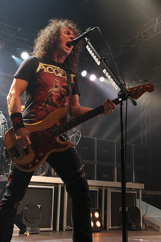 Eine halbe Stunde dauert die Umbaupause, dann stehen ACCEPT auf der Bühne. Und werden in den kommenden zwei Stunden beweisen, dass sie gefahrlos eine starke Vorband wie HELL mit auf Tour nehmen können, wohl wissend, dass man da noch locker einen draufsetzen kann. Im Hintergrund prangt ein großes Backdrop mit dem bunten Cover der "Stalingrad"-Platte (das ja nur eine Notlösung darstellt), davor erhöht das transparente Drumkit von Stefan Schwarzmann mit fettem Gong im Hintergrund und zwei riesigen Toms links und rechts. Vor den Drums ist eine kleine Fläche, auf die die Musiker über zwei Stege links und rechts kommen. Und wie es sich gehört, zieren insgesamt 27 Boxen mit ACCEPT-Logo das Bühnenbild. Das sieht laut aus und laut sind ACCEPT auch an diesem Abend. Viel zu laut ist zunächst der Drumsound und es dauert einige Zeit, bis man das in den Griff bekommt. Ab dann ist der Sound auch ausgewogen, aber in der Tat so laut, dass Ohrenstöpsel an diesem Abend dringend angebracht sind.