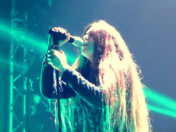 UNIVERSE 217 (sprich: Universe Two Seventeen) munkeln hören. Doch eine Ahnung, was da auf mich und uns in der Turbinenhalle zukommen sollte, hatte ich nicht so recht. Wann sieht und vor allem hört man eine Band, die rund 20 Jahre nach The 3rd and the Mortal eine ganz, ganz eigene Variante von Doom Metal (im weitesten Sinne) mit einer ausdrucksstarken Sängerin darzubieten hat? Die Griechen haben sich offenbar ihren ganz eigenen Zugang zu diesem Genre erschlossen, das seit geraumer Zeit arg populär ist und ergo mit Veröffentlichungen in solcher Vielzahl überschwemmt wird, dass es schwer fällt, den Überblick zu bewahren. Es spricht für das griechische Quartett, dass es trotzdem nicht an andere female fronted doom bands erinnert, sondern seine Musik auf eine solch vereinnahmende Weise zelebriert, dass ich ab der Hälfte des Gigs das Wort „Sakralhypnose“ dafür finde, mich bald in einer Kirche wähne und das metallische Drumherum gut ausblenden kann. Sängerin Tanya stimmliche Bandbreite ist ebenso bemerkenswert wie ihr Stimmvolumen und die Treffsicherheit bei in die Länge gezogenen Tönen. Die Frau hat Talent, Power und das nötige Selbstbewusstsein, um eine spielfreudige Band durch ein abwechslungsreiches wie stimmungsvolles Set zu führen. Ganz entfernt erinnert mich die