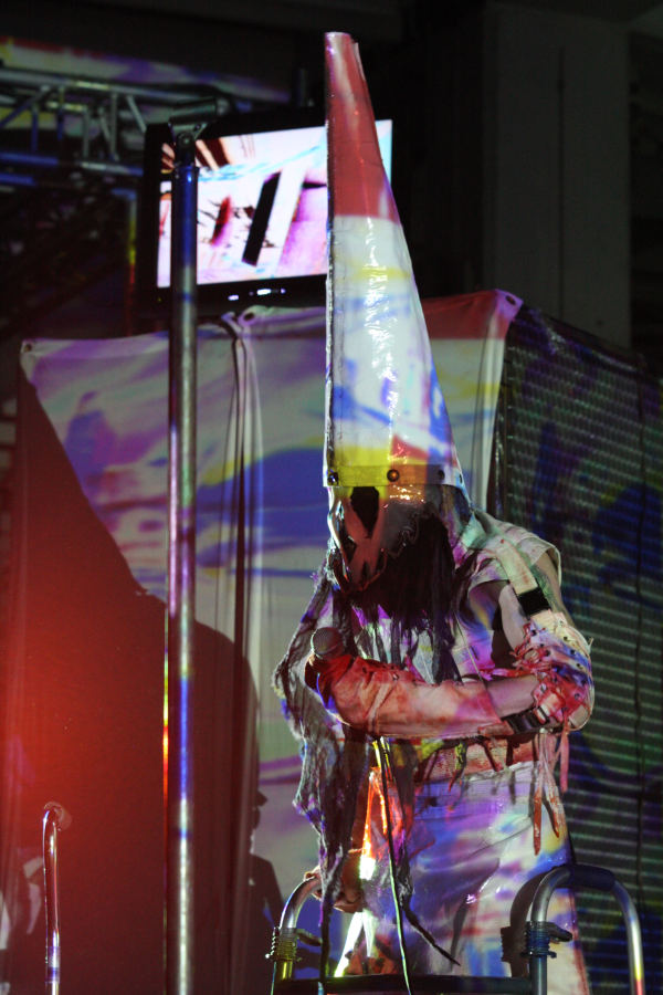 Spitzhut, verbundene Hände und ein ebenso verhüllter Körper sowie zahlreiche Blutflecken machen das Outfit aus und in Verbindung mit der Lichtinstallation sowie der Musik fühlt man sich wie in einem Horrorfilm oder einem bösen Alptraum. Die Singles "Addiction" und "Dogshit" folgen und im Verlauf des 80-minütigen Sets kommt man sich immer mehr wie im Rausch vor. In ohrenbetäubender Lautstärke werden "Tormentor", "Pro-Test" und "Ugli" ins Publikum gedroschen, das dann bei "Assimilate" endgültig austickt. Erst zu den Zugaben erscheint Ogre ohne Maske auf der Bühne und kündigt den Übersong "Worlock" an. Mit "Brap" und "Shore Lined Poison" wird das entrückte Publikum dann in die kühle Kölner Nacht entlassen. Was für ein wahnwitzig guter Auftritt - es erscheint unmöglich, da noch einen drauf zu setzen.
