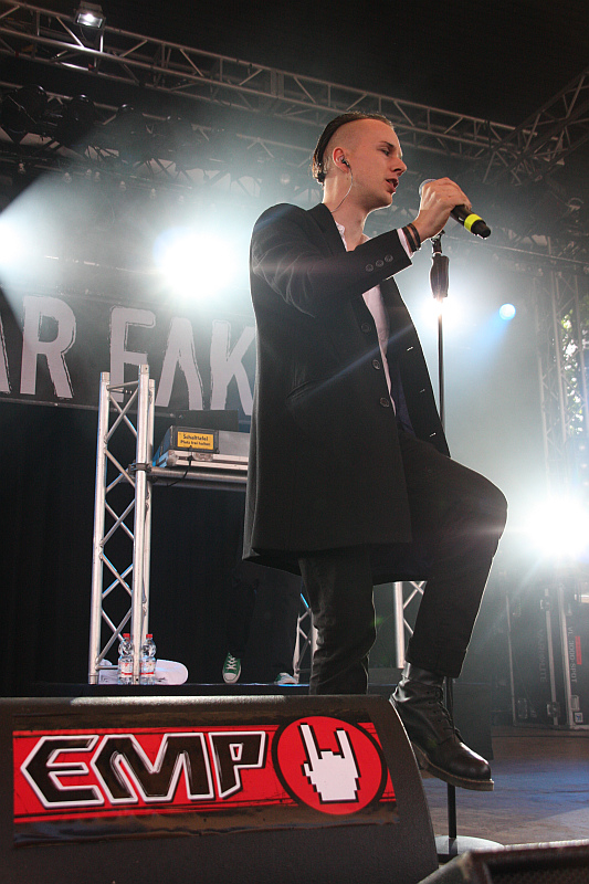Weiter geht es auf der Hauptbühne dann mit SOLAR FAKE. Sven Friedrich, ansonsten Sänger bei ZERAPHINE, ist zum zweiten Mal mit seinem Electro-Projekt beim Amphi Festival am Start und präsentiert mit seiner angenehmen Stimme zum größten Teil Songs seines zweiten Albums "Frontiers", die ein bisschen härter ausfallen, als das Material des Debüts "Broken Grid", von dem nur das schöne "Here I Stand" gespielt wird. Dazu tänzelt er wie immer gut gelaunt über die Bühne und bekommt reichlich Applaus vom Publikum.