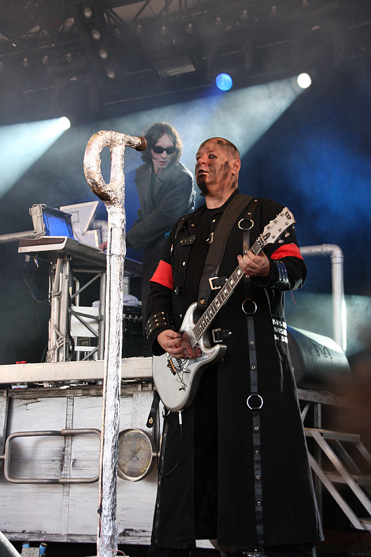 Kommen wir zum Tiefpunkt des Festivals in Form einer Band, die sich STAHLZEIT nennt und nichts anderes ist, als eine RAMMSTEIN-Coverband. Braucht es das wirklich auf einem solchen Festival? Es gibt doch genug Bands in der Szene, die mit erstklassigem eigenen Material überzeugen, warum also so ein Act? Klar, die Songs von RAMMSTEIN erfreuen sich höchster Beliebtheit, was heute auch daran sichtbar wird, dass das zahlreich vor der Bühne versammelte Publikum die Songs lauthals mitsingt. STAHLZEIT spielen die Nummern 1:1 nach, zünden kleinere Pyros und Feuereffekte und versuchen auch, die Posen der Originalband nachzuahmen. Das wirkt besonders beim Keyboarder aufgesetzt und unecht, wirklich authentisch wirkt letztlich aber keiner der Protagonisten. Eine Band fürs Sommerfest eines Bikerclubs, aber für ein solches Festival in meinen Augen völlig verzichtbar und unnötig.