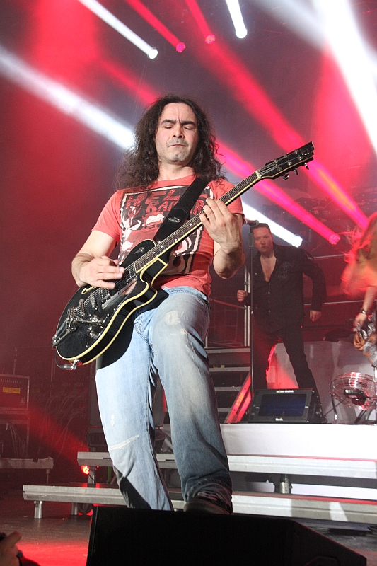 Und zwar mit einer kleinen Sensation, denn es dürfte ein paar Jährchen her sein, dass der ehemalige HEAVENS GATE-Gitarrist und langjährige AVANTASIA-Hofproduzent Sascha Paeth mit einem Leadsänger namens Thomas Rettke auf der Bühne stand. Der ehemalige HEAVENS GATE-Fronter steht nämlich nicht nur als Backgroundsänger neben Amanda Somerville, sondern übernimmt bei einigen Songs auch den Hauptgesang. Wie dem brettharten "Scales Of Justice", das im Original von Ripper Owens gesungen wird und bei dem Rettke zeigt, dass er stimmlich auch 2013 noch so einiges drauf hat. Danach wird der Knüppel aber wieder eingesteckt und die erste Ballade des Abends wird ausgepackt. Wie auch auf dem Album wird "What's Left Of Me" von MR. BIG-Frontmann Eric Martin angestimmt. Der wird seinem Ruf als ausgezeichneter Sänger jedoch nicht auf Anhieb gerecht, denn von allen bisherigen Frontleuten kann er zunächst am wenigsten überzeugen, beim flottmelodischen "Promised Land" von der "Angel Of Babylon"-Scheibe kommt aber auch er besser in Form. Oder ist sein Mikrofon nicht ordentlich eingestellt? Man weiß es nicht. Etwas überraschend entpuppt sich Martin aber auch als kleiner Zotenreißer und versucht, das Publikum mit seinen Witzchen bei Laune zu halten. Danach hat Frau Somerville ihren ersten großen Auftritt und zelebriert mit Tobi das wunderbar poppige "Sleepwalking", bevor Ronnie Atkins im superben "The Scarecrow" zeigt, dass er ein guter, aber nicht perfekter Ersatz für Jorn Lande ist, der diese Tour nicht mitfahren konnte. (ASZ)