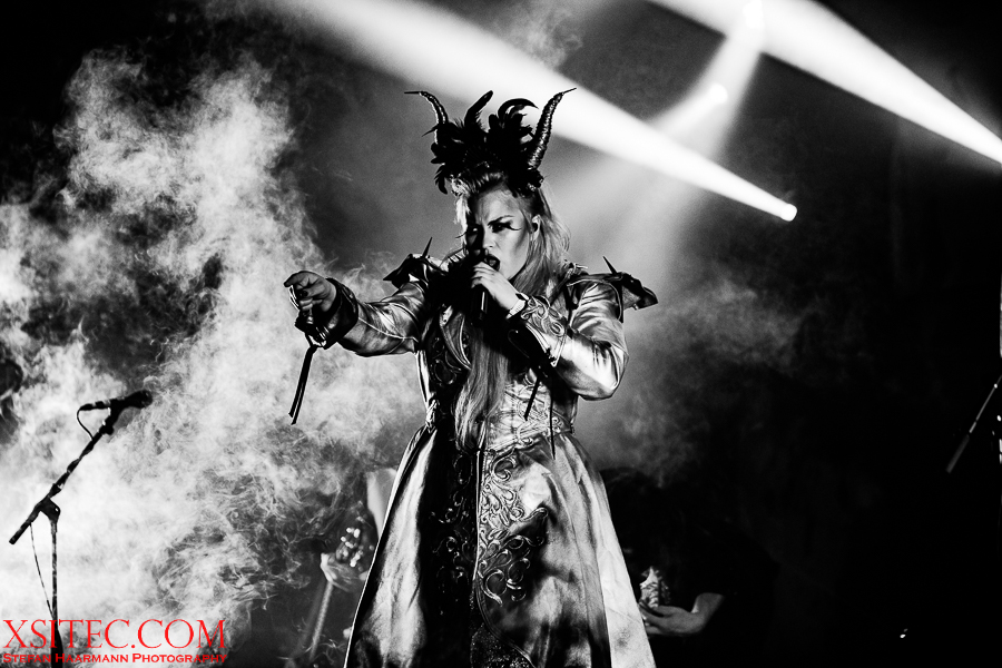 Nach einem Intro, das Drummer Pyry Vikki allein gehört, kommen Noora und ihre Jungs auf die Bühne der Zeche. Routiniert wird das verpatzte Intro zu „Unbroken“ kurzerhand noch einmal neu gestartet und ab diesem Zeitpunkt gibt es kein Halten mehr für die BEASTer, die ab der ersten Minute Vollgas geben, als ob der Leibhaftige selbst hinter ihnen her wäre. Noora, die, wie sie mir im Interview verriet, auf der Bühne immer unter Strom steht, saust von einer Ecke der Bühne zur anderen und hat sichtlich Spaß an ihrem Job.