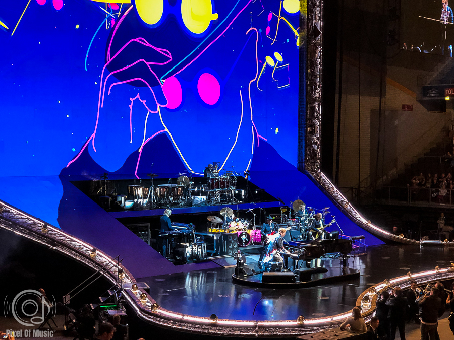 Pünktlich um 19:02 Uhr begann das von allen Besuchern heiß erwartete Konzert mit dem Song „Bennie and the Jets“. Der 72-jährige wirkte etwas gebrechlich und hatte sichtlich Probleme beim Laufen. Aber er war ja auch nicht für seine Sprinterqualitäten in Oberhausen, sondern als Musiker.