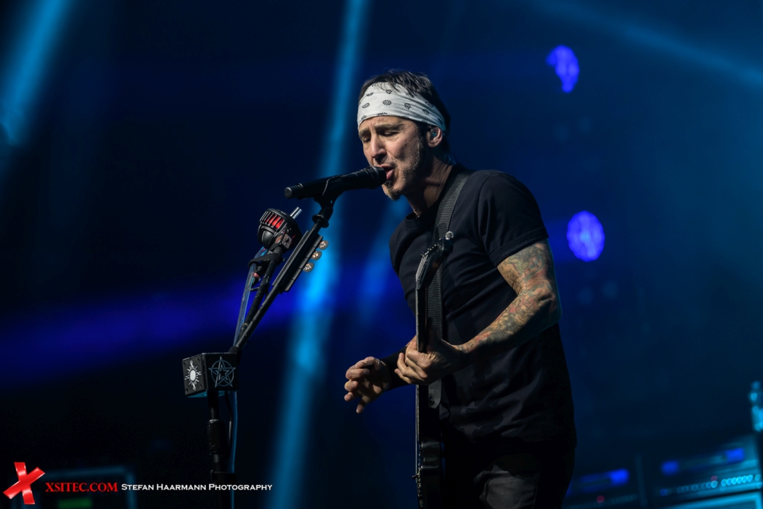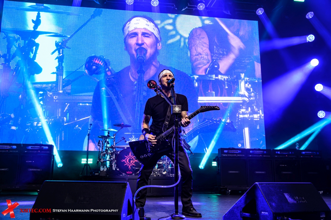 auf die Bühne, die sich in Sachen Spielwitz und Präsenz nicht hinter den langjährigen Bandmitgliedern verstecken muss. Sully Erna trägt wie fast immer sein obligatorisches Stirnband, die LED-Wall im Hintergrund, die für die beiden Supports nicht eingesetzt wurde, erstrahlt nun in voller Schönheit und untermalt die Szenerie mit Einspielern passend zu den Songs.