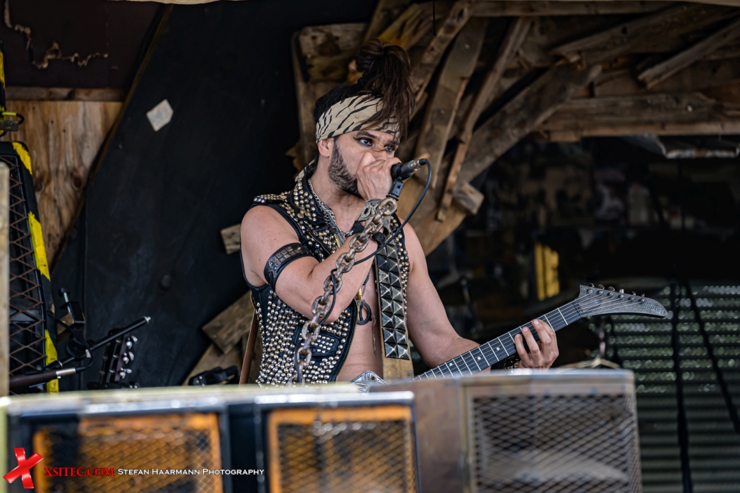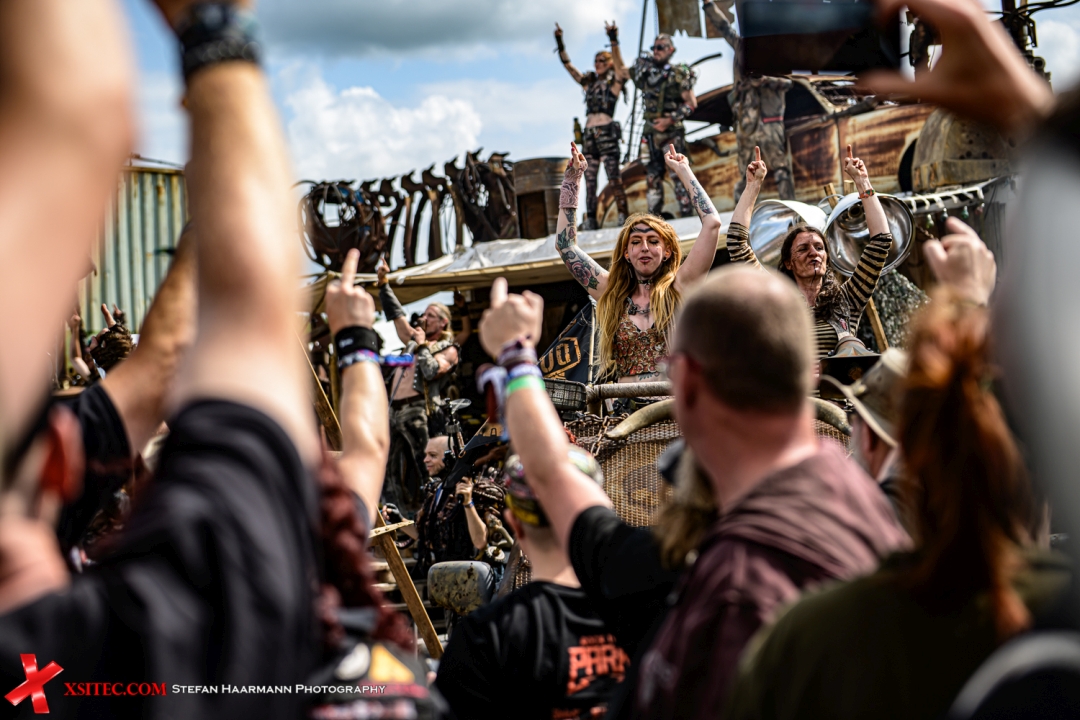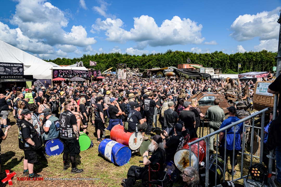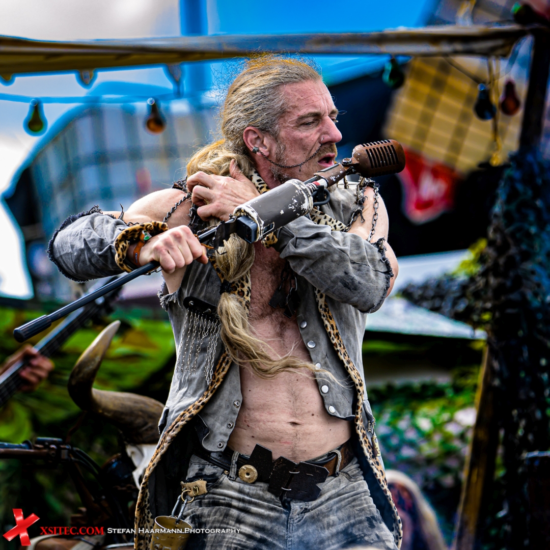 Am Nachmittag geht es weiter mit dem nächsten musikalischen Highlight: MEGABOSCH auf der Wasteland Stage. Die Band ist bekannt für ihre energiegeladene Mischung aus Industrial Rock, Metal und einer Prise postapokalyptischer Show. Zwischen Schrottplatz-Ästhetik, brummenden Motorengeräuschen und wuchtigen Gitarrenriffs brodelt die Stimmung. Das Publikum feiert dicht gedrängt vor der Bühne, während die Sonne vom Himmel knallt.