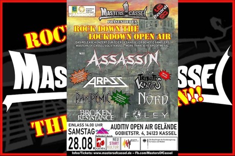 Das Open Air Konzert wird am Samstag den 28. August ab 14.00 Uhr auf dem Open Air Gelände der Firma Auditiv Event- und Medientechnik in Waldau, Gobietstraße 4, stattfinden. Line-up technisch lassen wir es in dieser schwierigen Zeit richtig krachen und haben auf den Headlinerposten neben der deutschen Thrash Metal Legende Assassin aus Düsseldorf mit den Kasselern Arass eine Band aus der lokalen Historie mit dabei, die seit über 25 Jahren nicht mehr live gezockt hat und deren Reunion-Konzert exklusiv bei uns stattfindet. Beide Bands sind ein echter Live-Leckerbissen, den man nicht verpassen sollte. Den Abschluss des Abends wird die Kasseler Metal Cover Band Tribute Kings machen, die nach beiden Headlinern die Party am Laufen halten wird.