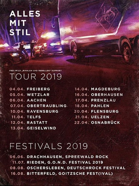 16.04.19 Hamburg, Gruenspan 17.04.19 Kiel, Kulturforum 18.04.19 Cuxhaven, Captain Ahab’s Culture Club 20.04.19 Hoyerswerda, Speicher1 21.04.19 Hoyerswerda, Speicher1 (Zusatzkonzert) 23.04.19 Hannover, Pavillon 24.04.19 Darmstadt, Centralstation 26.04.19 Zwickau, Alter Gasometer 27.04.19 Westhofen, Gut Leben am Morstein 29.04.19 Köln, Kulturkirche 03.05.19 Worbswede, Music Hall 09.05.19 München, Zehner 09.08.19 Xanten, Amphitheater 10.08.19 Ludwigsburg, Kulturgarten Eichen