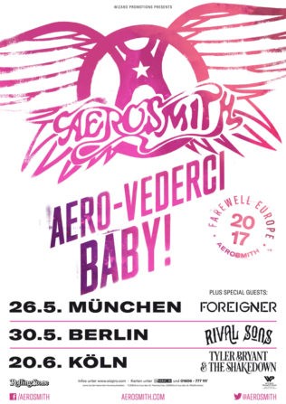 Der Tourstart der Aero-Vederci Baby! European Tour 2017 von Aerosmith rückt näher. Am 26. Mai 2017 startet die größte Rock-and-Roll-Band der USA, nach einer Reihe unglaublich erfolgreicher Shows in Südamerika, ihre Abschieds-Tournee in Deutschland. Mit den Retro-Rockern Rival Sons für Berlin sowie den Nashville Blues-Rockern Tyler Bryant and the Shakedown für Köln präsentieren Aerosmith ein absolut hochkarätiges Paket für ihre Deutschland-Konzerte. Bereits angekündigt wurde der Auftritt der Rock-Legenden Foreigner in München.